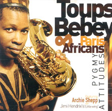On swingue, on bouillonne, on groove. On est furieusement afro. Tout ceci relate la même histoire dont on vous ressasse l'imaginaire quasi déroutant depuis le début de ce texte. Appelez son jazz comme vous le voudrez… Toups trace sa route. Une musique syncrétique à souhait jamais, qui improvise probablement sans trop le crier sur les toits pour ne pas nous angoisser et qui recherche sans doute "la beauté, l'émotion, la nostalgie, l'excitation, la jeunesse, la révolte, tout cela sans doute", retrouvez Carles et Comolli dans la pertinence du propos. Toups Bebey nous entraîne dans son dernier album, Pygmy Attitudes, dans la polyphonie et la transe rythmique de ce peuple bantu qui vit en forêt profonde sur le continent noir. Avec une voracité qui emprunte à la fureur des Caraïbes et à l'immensité du patrimoine sonore issu du reste du monde. Avec intelligence et grâce, les dieux du jazz ne pouvaient que l'accompagner dans ce nouvel opus. Leur souffle en tous les cas est là, présent sur l'ensemble des titres. Duke Ellington, Thelonious Monk et les aïeux sont invoqués en toutes lettres. Archie Shepp en personne bénit le preux Bebey. Sur une reprise de Little Wing de Jim Hendrix. Un vrai régal ! Et sans commentaires… Ah ! Si ! Toups aussi est passé par la jazz world connection parisienne.