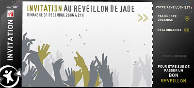 Inscrivez-vous sur RFI, à l’adresse RFI.newyearsignal.com. Si vous n’avez rien de prévu pour votre réveillon, vous allez être mis en contact avec d’autres personnes partageant vos intérêts, et qui sont disponibles pour le réveillon. Vous pourrez alors participer au réveillon de Jade : un réveillon-flash dont l’endroit sera communiqué la veille, pour lequel votre mobile vous mettra en relation de manière ludique avec ceux qui partagent vos intérêts.