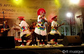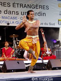 Ils arrivent en procession, dans de splendides costumes roses et orangés. S’assoient doucement sur la scène. Encadré par deux joueuses de tempura, Ragunath Manet a posé la veena devant lui sur ses jambes repliées. Derrière eux, les deux percussionnistes et la chanteuse qui s’accompagne au sarod attendent le signal. C’est parti, il est 18 heures à Paris, les ragas s’élèvent sous un ciel nuageux, se glissent entre les arbres du parc du Ministère des Affaires Etrangères, enveloppent les spectateurs assis sur la pelouse. Ragunath Manet se lève et commence torse nu une danse sacrée de l’Inde du Sud, le Bharata Natyam. Chaque geste, chaque muscle exprime une émotion, un sentiment. Pris dans les volutes, le public, très mélangé, de toutes les générations, apprécie la performance.Ce n’est que le début d’une soirée qui commence très bien. L’animateur de Couleurs Tropicales sur RFI, Claudy Siar, assure en maître cérémonie. Il annonce maintenant le groupe camerounais Macase, prix RFI Musiques du monde 2001. Le big band (sept artistes) met le feu à la piste sur des rythmes zairois, zouk, soul, jazz… Dans sa roue, le Dominicain Mangu enchaîne très fort, occupe le terrain de la danse, pousse loin en avant le hip hop et le ragga latinos. La fièvre afro-cubaine monte malgré la pluie qui tombe à gouttes comptées. Les enfants sont à la fête, sautent partout. Deux rappels pour le prix Découverte RFI 1998!