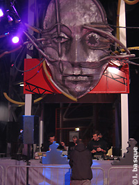 Au dernier morceau, un "pied" techno émerge de la deuxième scène du hall. Les plus affamés s’engouffrent. Electro tendance psychédélique. Le décollage s’effectue en douceur, on peut encore discuter face aux enceintes ! 10 minutes plus tard, l’ambiance est tout autre dans la grande salle. Assaut de décibels, beat bien binaires, boucles corrosives en action. Depuis le début de son aventure, Hérétik a toujours collaboré avec des troupes de théâtre ou de performers. Ce soir, outre des cracheurs de feu, des danseurs robotiques, on peut assister à cette pièce surréaliste sur scène. Quatre personnages en combinaison antiradiation style Tchernobyl coursent un bel ouvrier au casque immaculé. Ils lui arrachent ses vêtements, le poussent à terre. Montant sur des podiums, ces créatures se délestent de leur étoffe pour laisser apparaître des femmes en cuir et guêpières. Poses suggestives à l’appui. Sur scène le délire continue : des hommes encagoulés avec combinaisons noires tentent de chasser ces viles tentatrices. Elles ressurgissent armés de canons à confettis.