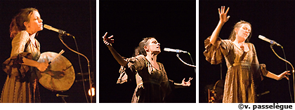 De sa double culture franco-anglaise, elle garde une grande liberté face à l’emploi du français ou de l’anglais, intégrant la tradition du folk américain comme celle de la chanson française. Celle-ci lui permet quelques incursions dans le monde de l’enfance : "avec le langage de l’enfance, on peut dire des choses profondes, parfois brutales" comme elle le souligne. Sur scène, habillée d’une robe néo-hippie, on la croirait tout droit sortie d’un épisode de La Petite maison dans la prairie. Et pourtant…la jeune femme affiche plutôt une image de chef de bande, à la tête d’un "big bazar" qui rassemblait aussi ce soir-là l’Américain Piers Faccini et le Malien Victor Démé. La rencontre avec ce dernier, l’a enthousiasmée : peut être une autre piste pour invoquer d’autres esprits.